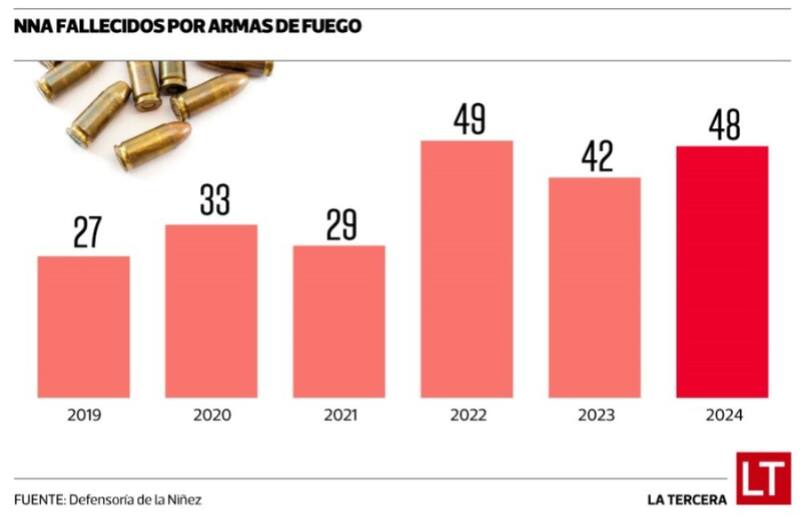 Son 48 niñas, niños y adolescentes (NNA) los que habían fallecido durante este año y hasta la segunda semana de noviembre producto de armas de fuego. La estremecedora cifra es revelada en el Informe Anual de la Defensoría de la Niñez al que tuvo acceso La Tercera. Lo preocupante es que el dato no sólo supera los 42 casos registrados en todo 2023, sino que además está a un fallecimiento de alcanzar el año más sangriento de las últimas dos décadas, récord que data de 2022.