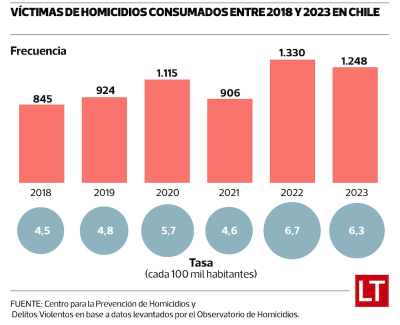En términos globales, desde el 2018 al 2023 se registró un aumento de víctimas de homicidios consumados de un 47,6%, pasando de 845 a 1.248 o de una tasa de 4,5 asesinatos por cada cien mil habitantes a una de 6,3. Sin embargo, el año peak -hasta el momento- fue el 2022, cuando los homicidios alcanzaron 1.330, lo que se tradujo en una tasa de 6,7 por cada cien mil habitantes.