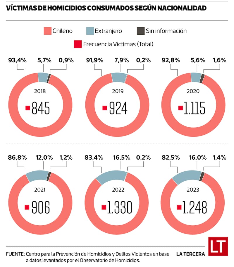 En esta evolución destaca un dato: el porcentaje de víctimas extranjeras casi se triplicó en sólo cinco años. Si en 2018, los extranjeros representaban el 5,7% del total de homicidios ese año (48), en 2023 pasó a un 16%, con casi dos centenares de personas. Sólo para comparar, las víctimas chilenas pasaron de ser el 93,4% del total de víctimas al 82,5% en el mismo periodo.