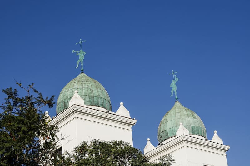 Un rasgo distintivo del pequeño templo fueron sus dos torres coronadas con cúpulas de cobre y dos veletas con figuras infantiles, levantadas en homenaje a sus dos hijos.