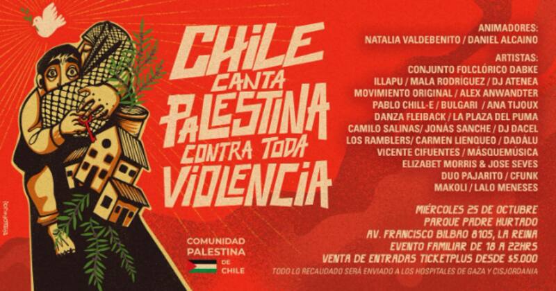 El evento familiar “Chile canta Palestina contra toda violencia” se realizará entre las 18.00 y 22.00 horas y las entradas –que van desde los cinco mil pesos– ya están a la venta. Desde la organización precisaron que todo el dinero recaudado será enviado a Palestina para la compra de insumos médicos.