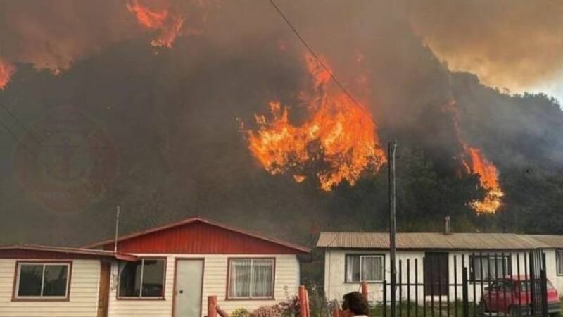 Se trata de un incendio de pinos y árboles nativos de rápida propagación, afectando a dos estructuras.