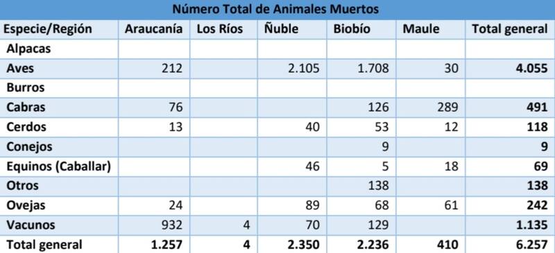 Ñuble se mantiene como la región más afectada por la muerte de animales ganaderos, con un total de 2.350 animales, le siguen Biobío -con 2.236- y La Araucanía, con 1.257.