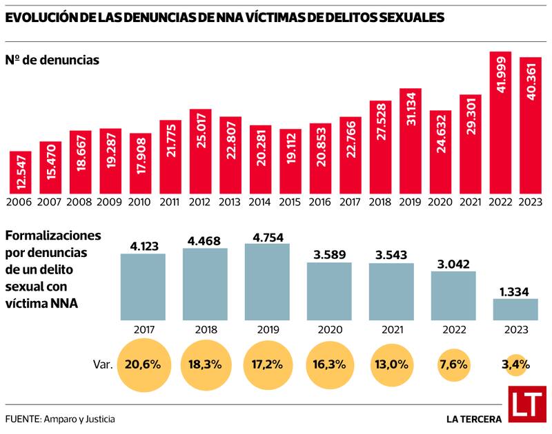 Desde 2006 y hasta el 2023 el Ministerio Público ha recibido 362.355 denuncias por delitos sexuales en los que la víctima es un niño, niña o adolescente (NNA). Durante el 2023, según el último informe de la Fundación Amparo y Justicia, este tipo de hechos disminuyó un 3,9% en comparación con el año antepasado. Pese a eso, desde el organismo se mantienen alerta ya que el número de denuncias sigue siendo superior a los 40 mil casos.