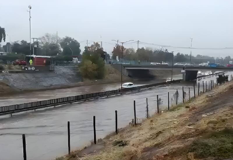 Mientras que en Pudahuel se informó del colapso de sumideros de aguas lluvias en la Ruta 68, a la altura del puente Centenario en Avenida Teniente Cruz. En el lugar trabaja personal de Carabineros y de Vialidad.
