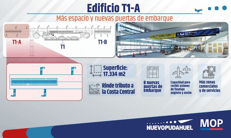 Además, se ampliará el terminal T1 con la construcción del “edificio T1-A”, estructura que ya está avanzada y que sumará ocho nuevas puertas de embarque y más de 17.000 m2 adicionales de espacio.