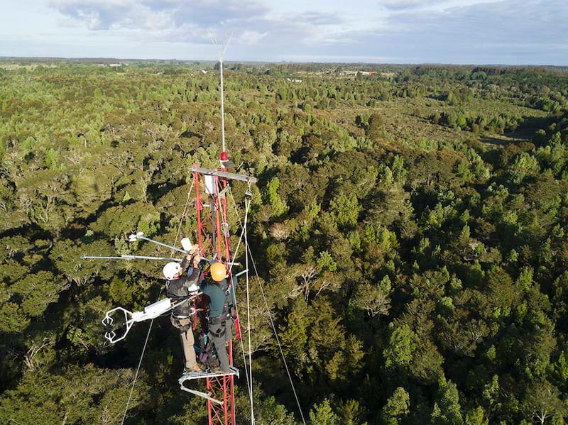 Desde agosto de 2013 el Instituto de Ecología y Biodiversidad (IEB) instaló una torre en la mitad del sitio -llamada Eddy Covariance-, que tiene 42 metros de alto y mide entre otras cosas el flujo de dióxido de carbono que intercambia el bosque con la atmósfera. “Es el primero que se instaló y uno de los pocos que hay en Sudamérica, y que justamente apunta a ver cómo está reaccionando el bosque frente al cambio climático”, explica el investigador del IEB y académico de la Universidad de Chile Jorge Pérez Quezada.