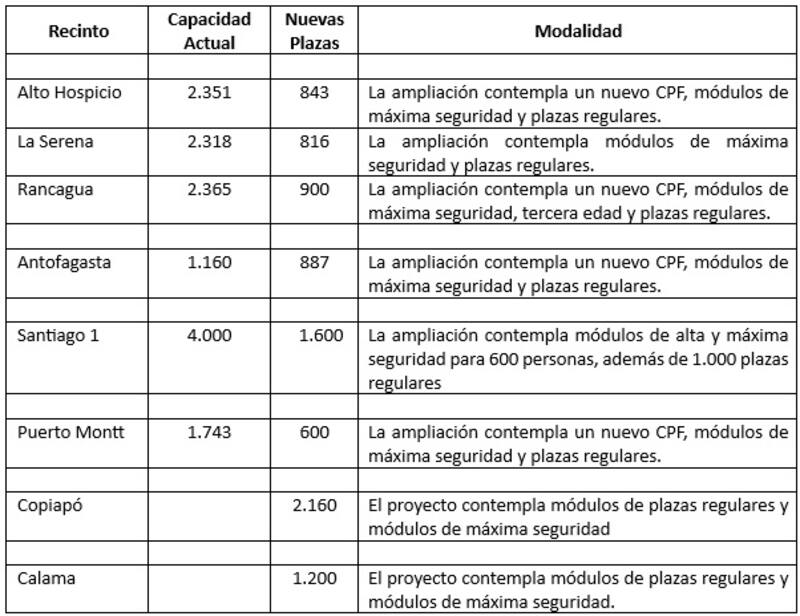 Como pudo conocer La Tercera, la iniciativa, denominada fast track de infraestructura penitenciaria, tiene asociado un plan que contempla la habilitación de 9.006 nuevas plazas.