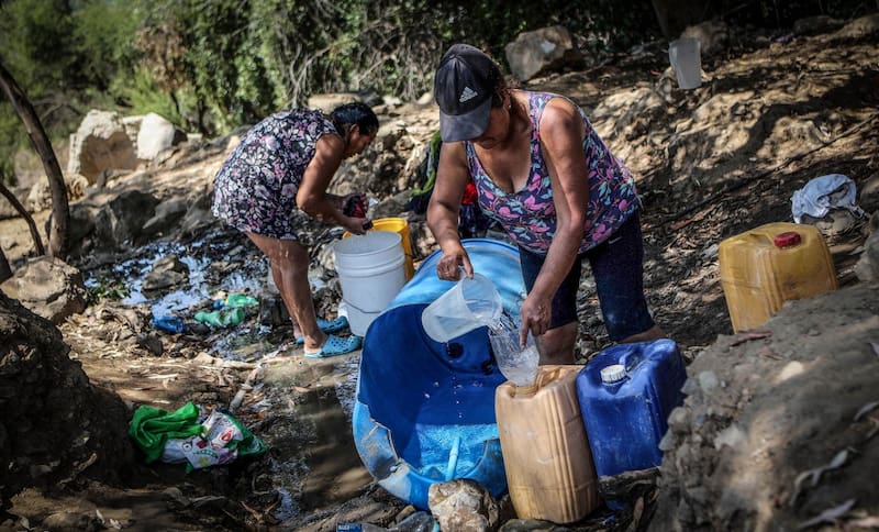 En este terreno, propiedad de Socovesa, no cuentan con alcantarillado y la única forma de obtener agua es robándola a una copa que se ubica 200 metros más abajo, donde además es el lavadero de la comunidad. Aunque el agua no es potable, cada familia llena baldes y tarros durante varias horas. “Y para subirlos, debemos esperar a que llegue un vecino con vehículo para que nos traslade. No lo hacen gratis: cobran 10 mil pesos por transportarnos el agua. A veces estamos aquí toda la tarde esperando que alguien llegue a subirnos”, dice Carmen Guevara (32), otra peruana de la toma, mientras carga sus bidones.