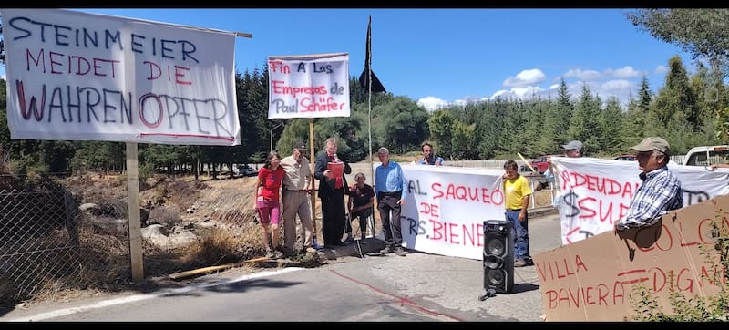 “Steinmeier meidet die wahren opfer” (Steinmeier evita a las verdaderas víctimas), decía un cartel en alemán que un grupo de hombres y mujeres instaló al bloquear, la mañana del pasado lunes 3 de marzo, la ruta que une Parral con Villa Baviera, en la Región del Maule. Con un parlante y otras pancartas que decían “fin a las empresas de Paul Schäfer”, unas 10 personas impidieron por unos minutos la llegada de turistas al hotel y al restaurante de la ex Colonia Dignidad.