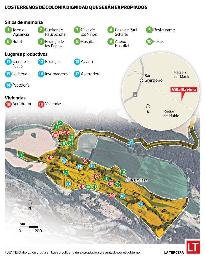 Al superponer la superficie de expropiación presentada por el gobierno a un mapa real de la zona, una cosa salta de inmediato a la vista: además de lugares emblemáticos del horror que allí se vivió, como la casa de Paul Schäfer, el hotel, el restaurante y el exhospital, todas las otras construcciones de la villa, incluyendo casas, fábricas y galpones, también serán expropiadas con miras a la instalación de un sitio de memoria.