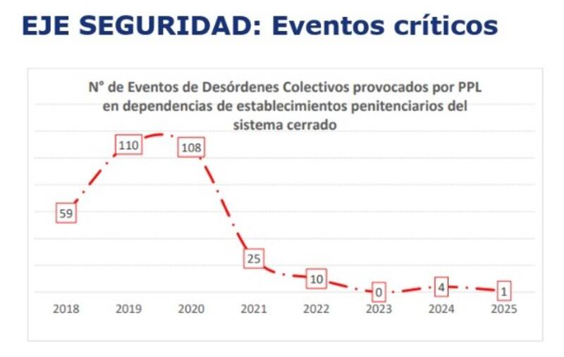 Así el ministro detalló que mientras la población penal sólo ha ido al alza desde 2021, llegando actualmente a 64.151 personas en régimen cerrado, los eventos críticos han llegado a mínimos históricos. Si en 2019 se registraron 110 situaciones graves, en 2024 se contabilizaron cuatro y en lo que va de 2025, sólo se registra una. De igual forma, mencionó que entre 2022 y 2025 sólo se contabilizan 32 fugas desde recintos penitenciarios. En tanto, entre 2018 y 2021 hubo 46 fugas.