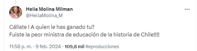 Las palabras de quien también fuera convencional constituyente no parecieron caer bien a la diputada PPD Helia Molina. En respuesta a una publicación de prensa, la exministra de Salud del gobierno de Bachelet disparó: “¡Cállate! ¿A quién le has ganado tú? Fuiste la peor ministra de Educación de la historia de Chile!!!!”.
