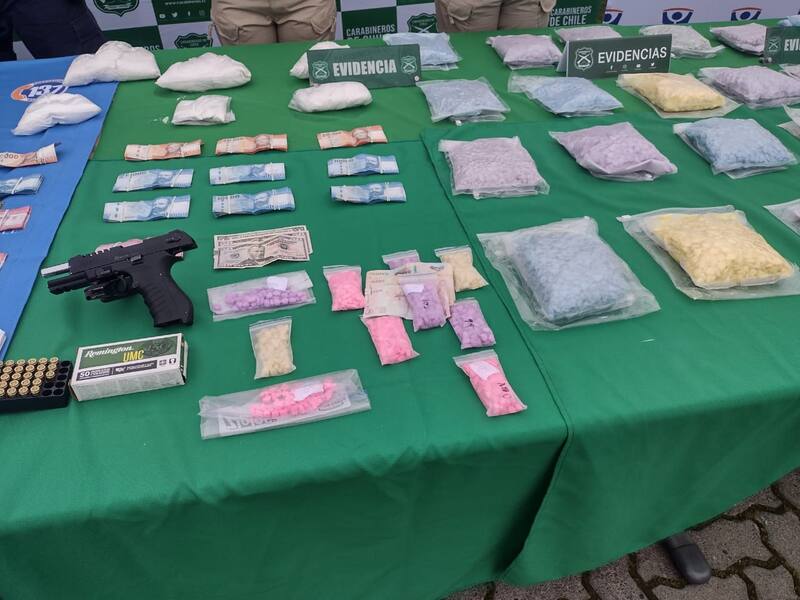 Además, en los domicilios allanados se incautaron 888 pastillas de éxtasis, 2,944 kilogramos de cocaína, 532 gramos de pasta base de cocaína y marihuana.