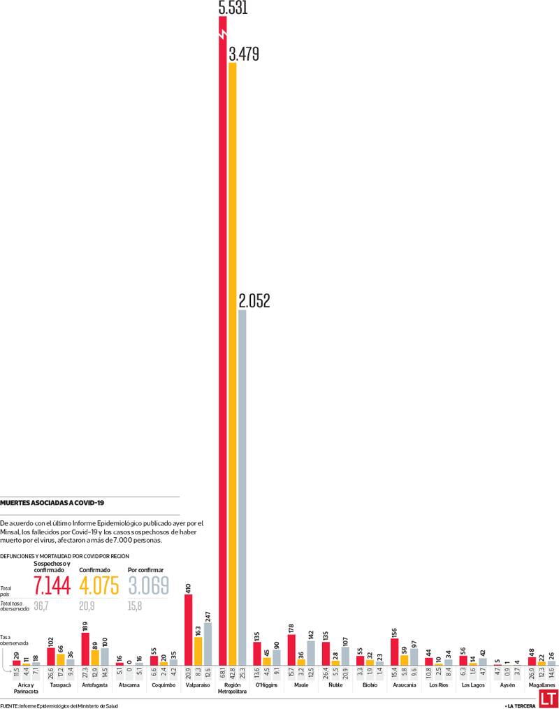 Según el reporte, hasta el 18 de junio había 4.075 muertes confirmadas de coronavirus, similar a los datos del Registro Civil. Pero además incluyó otros 3.069 decesos que probablemente fueron causados por el virus, pero que aún no han sido confirmados por los laboratorios. Es decir, existen 7.144 muertes ligadas a la enfermedad (ver infografía).