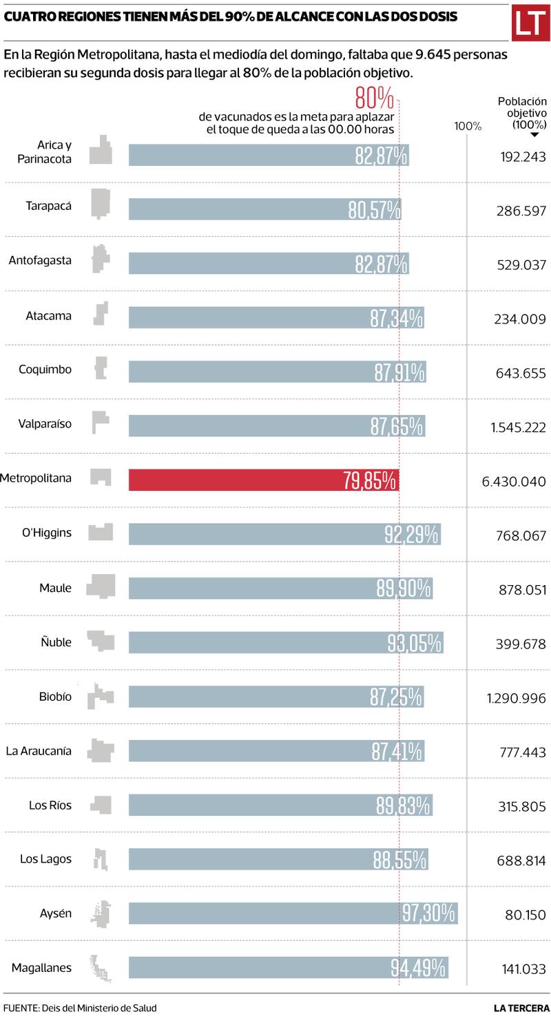 Las excepciones han sido hasta ahora las regiones de Tarapacá y Metropolitana, que no habían llegado a la meta. Sin embargo, la primera logró este fin de semana llegar al umbral y ya tiene al 80,6% de su población vacunada, por lo que esta semana se anunciará el acortamiento del toque de queda en Iquique y el resto de sus comunas.
