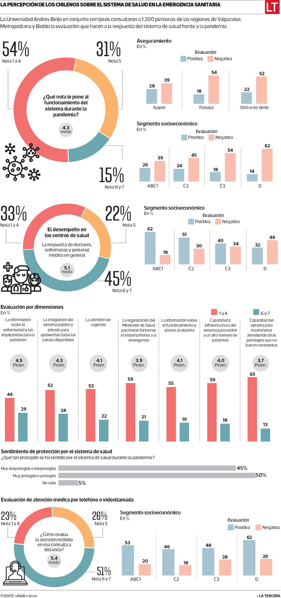 ¿Qué nota le pone al sistema de salud durante la pandemia? Esa fue una de las interrogantes de la encuesta que realizó la Universidad Andrés Bello junto con Ipsos para conocer la percepción de los chilenos frente a la gestión de la red asistencial en la emergencia. ¿La respuesta? Un 4,3, con un 15% de los consultados que destacó su funcionamiento, un tercio que simplemente lo aprueba y un 54% que lo evalúa negativamente.