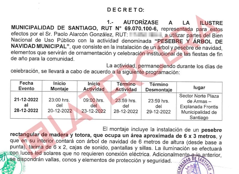 Ese mismo día, otro documento relacionado al evento fue emitido desde la Municipalidad de Santiago. En específico, el Decreto Número 9793, firmado por el mismo secretario municipal subrogante y por Bernardita Lorenzini Izaga, directora de Fiscalización de Santiago. Allí, se autorizó a la misma municipalidad a ocupar -sin costo- un trozo de la Plaza de Armas para la actividad denominada “Pesebre y árbol de Pascua municipal” entre el 21 y el 28 de diciembre.