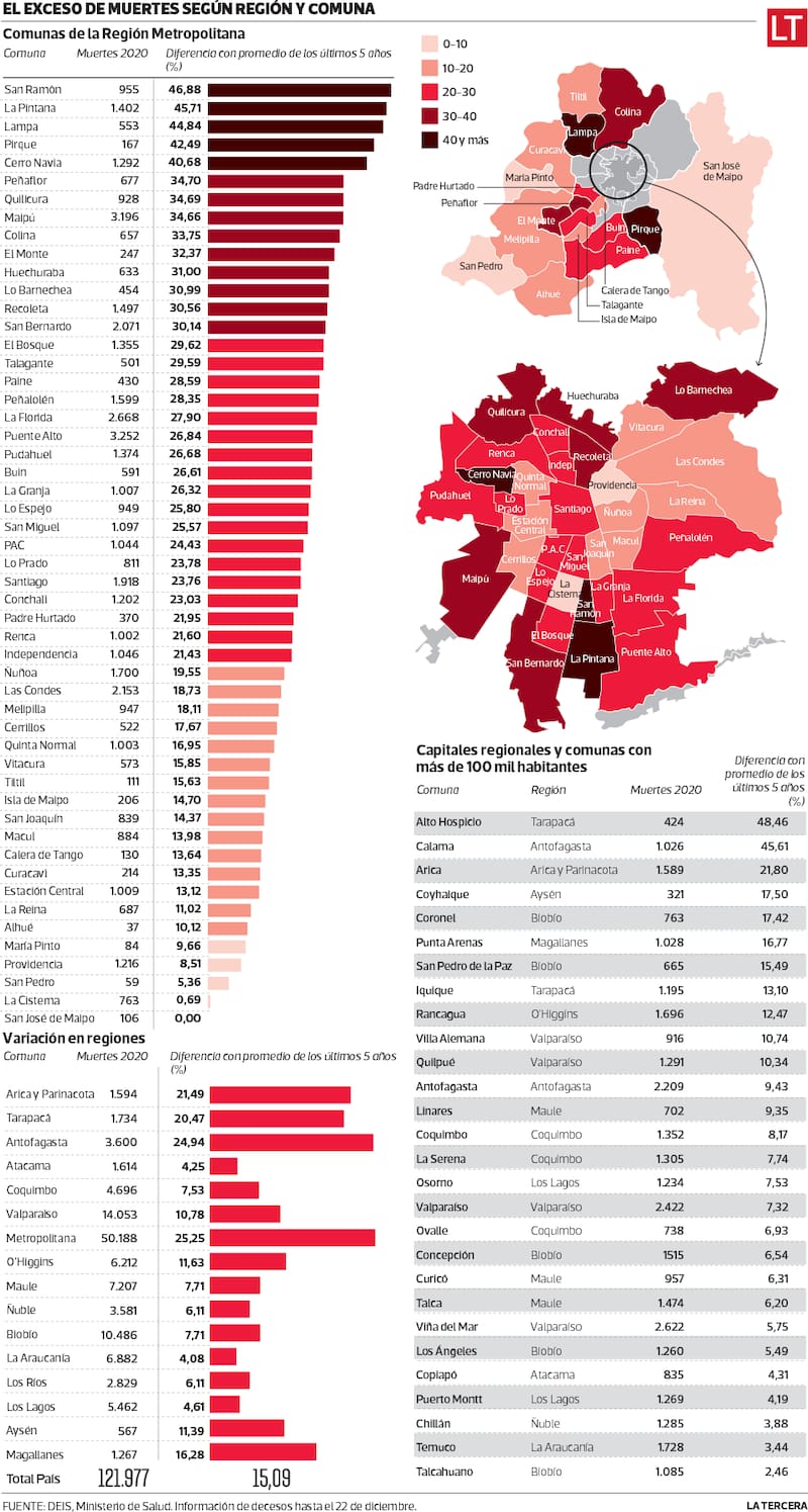 En la estadística de exceso de muertes, que se toma comparando los datos entregados por el DEIS del Ministerio de Salud del último año contra el promedio de decesos de los cinco años previos, San Ramón presentó un alza de 46,88% y La Pintana, de 45,71, las dos comunas con mayores cifras de la Región Metropolitana. Sobre el 40% se ubicaron también Lampa (44,84%), Pirque (42,49%) y Cerro Navia (40,68%). El promedio regional fue de 25,25%, el más elevado de todo el país.