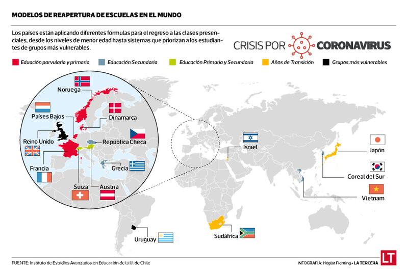 Cuando se cumplieron las condiciones, el retorno fue en distintos niveles. Por ejemplo, en Francia y Noruega se partió por la educación parvularia y primaria (básica). En Grecia y Corea del Sur empezaron con la educación secundaria; en Suiza, con la primaria y secundaria; en Japón e Israel, con los años de transición (como 4° medio); y Uruguay y Reino Unido partieron con los niños más vulnerables.