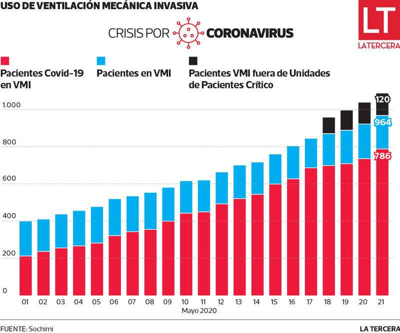 Según la Sociedad Chilena de Pediatría, al 20 de mayo se habían entregado 100 camas críticas de niños a adultos, y de todos los ventiladores pediátricos en uso, dos tercios los tenían mayores de edad con coronavirus. Mientras, según el reporte de Sochimi, ayer había 120 pacientes en ventilación mecánica fuera de las UCI, principalmente en unidades de anestesia y en Urgencias, todos ellos en Santiago.