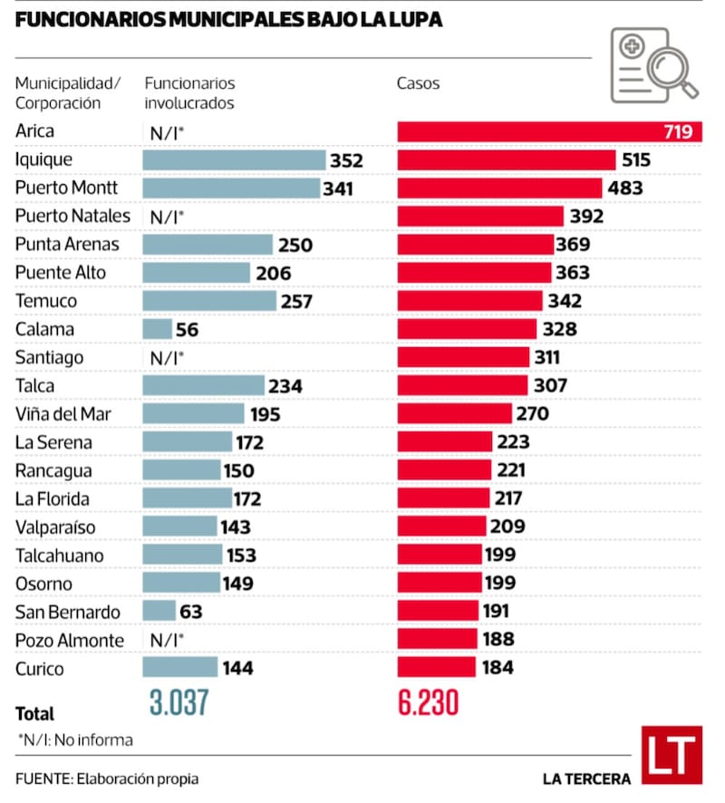 La comuna con más casos es Arica, donde se instruyeron 719 sumarios, los que no necesariamente implican al mismo número de personas, porque cada acto administrativo puede considerar a más de un individuo. Debido al volumen, el municipio dice no haber consolidado aún el número exacto de trabajadores involucrados y evalúa adquirir un software de gestión y contratar asesoría legal, con un costo estimado de $ 40 millones. Eso sí, el alcalde Orlando Vargas se aventura con algunas de las razones de su alto número de funcionarios en la mira: “Muchos iban a Tacna, Arequipa o Bolivia”.