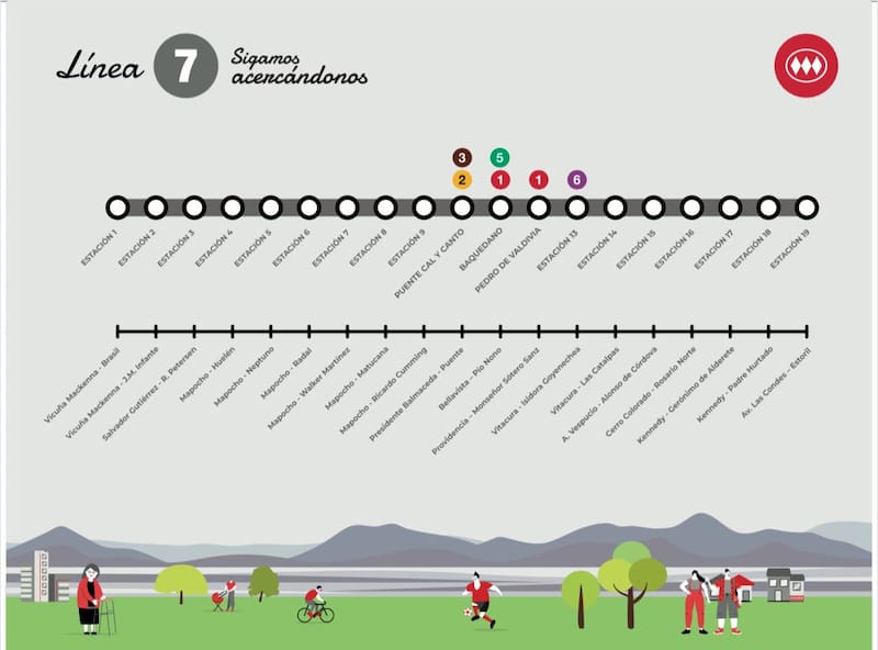 En concreto, la Línea 7 contará con 19 estaciones y tendrá 26 kilómetros de longitud, los que contemplan ocho comunas: Renca, Cerro Navia, Quinta Normal, Santiago, Recoleta, Providencia, Las Condes y Vitacura.
