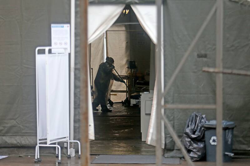 Según se puede ver en imágenes, el agua inundó el interior de las carpas donde se encontraban pacientes sospechosos de coronavirus y algunos de ellos fueron trasladados en camillas envueltos en plástico.
