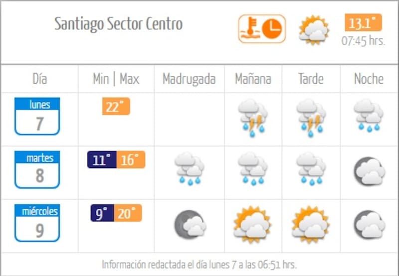 De acuerdo al pronóstico de la Dirección Meteorológica de Chile (DMC), la temperatura máxima que alcanzará este lunes la Región Metropolitana (RM) será de 22°, mientras que se sostendrán precipitaciones durante gran parte del día.