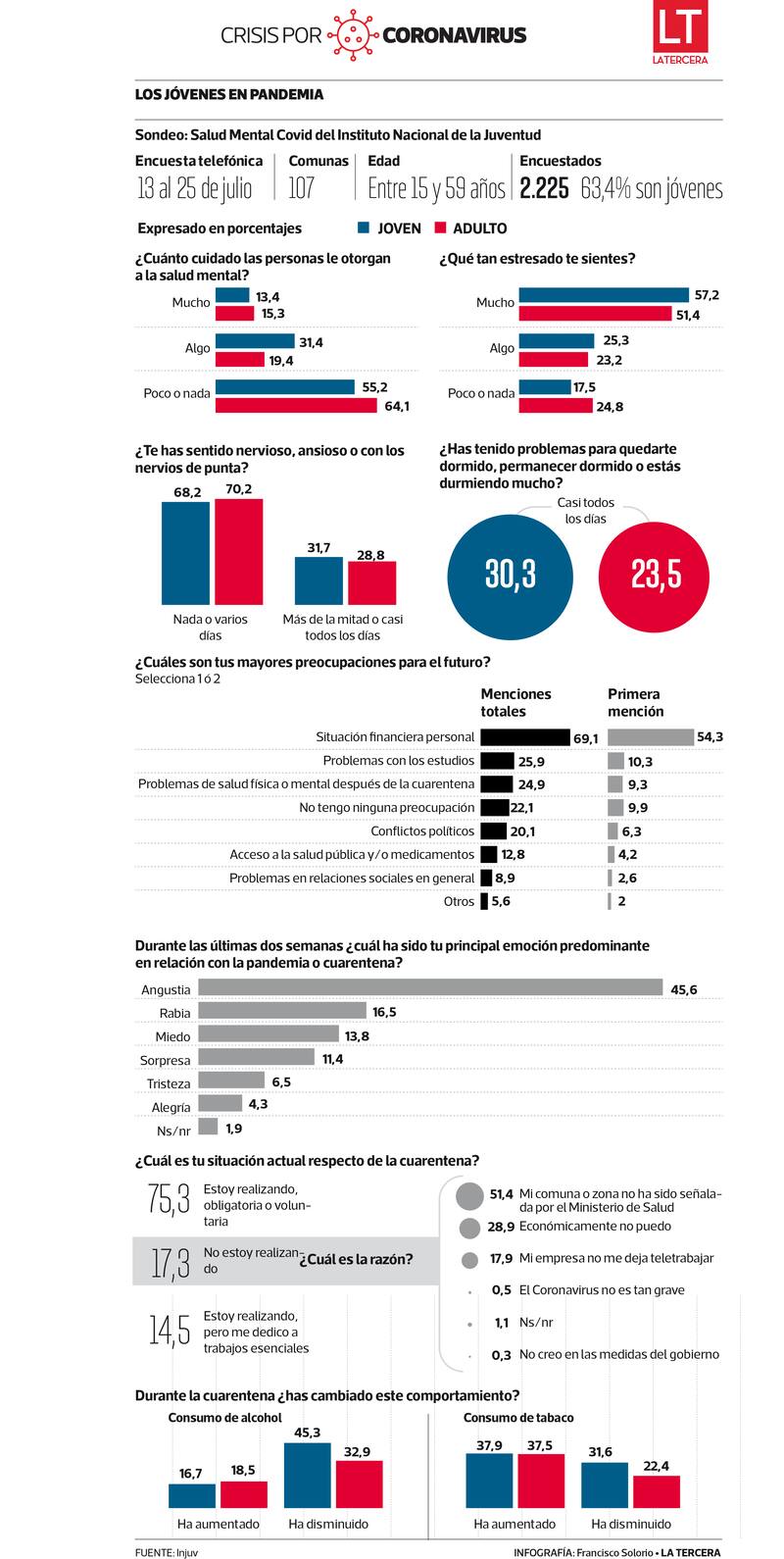 Angustia, preocupación por el futuro financiero y menos consumo de alcohol es, muy resumido, lo que hoy está viviendo la población joven por la pandemia por coronavirus. Eso indica el Sondeo Salud Mental Covid que el Departamento de Estudios del Instituto Nacional de la Juventud (Injuv) hizo junto a la Dirección de Estudios Sociales de la Universidad Católica, con el objetivo de conocer la situación de salud mental de esa parte del país y conseguir cifras. “Ya sabíamos que los jóvenes estaban con angustia y ansiedad, pero ahora tenemos lo cuantitativo y eso nos muestra que vamos en buen camino en los múltiples programas en los que llevamos más de un año trabajando”, señala María Asunción Cekalovic, directora subrogante del Injuv.