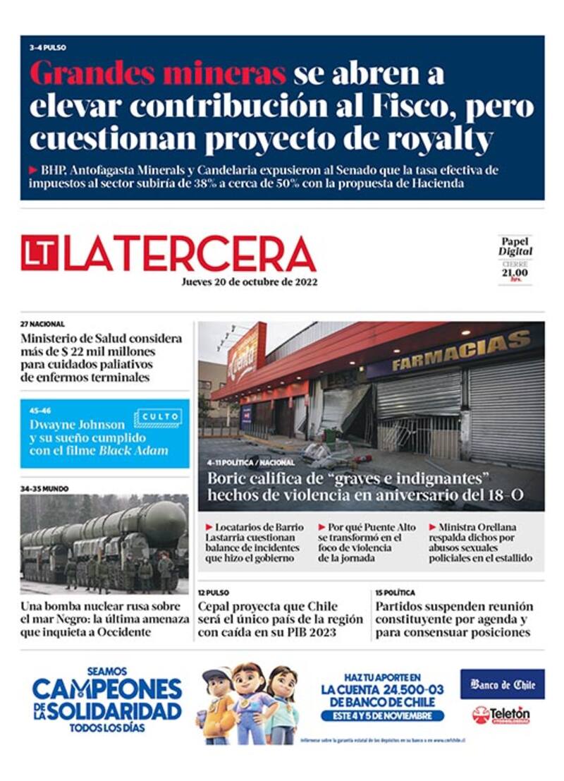 Por Mauricio DonosoLo que tienes que saber este jueves en La Tercera: Boric califica de “indignantes” los hechos de violencia en conmemoración del estallido y Jadue dice que “represión sigue intacta”