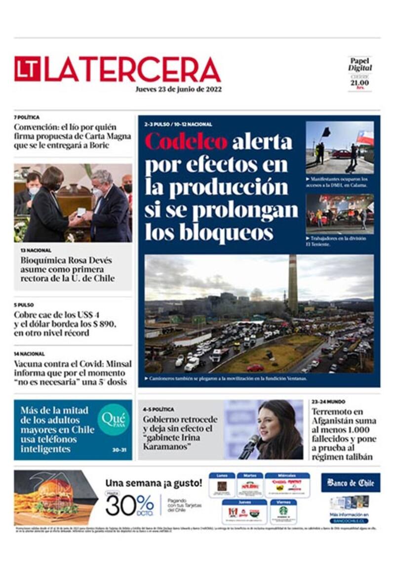 Por Mauricio DonosoLo que tienes que saber este jueves en La Tercera: Codelco alerta por efectos en producción si se prolongan bloqueos a los accesos de sus divisiones y trabajadores aceptan sentarse a negociar
