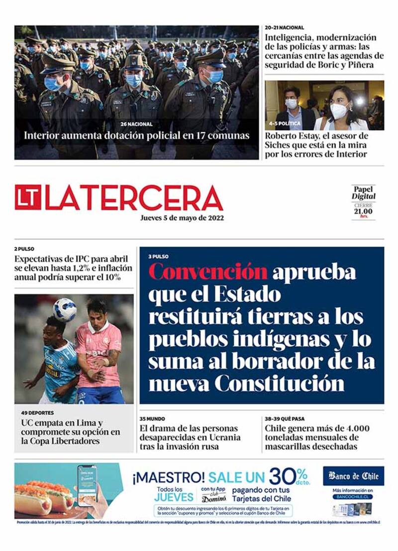 Por Mauricio DonosoLo que tienes que saber este jueves en La Tercera: Convención aprueba que el Estado restituya tierras a los pueblos indígenas como un mecanismo preferente de reparación