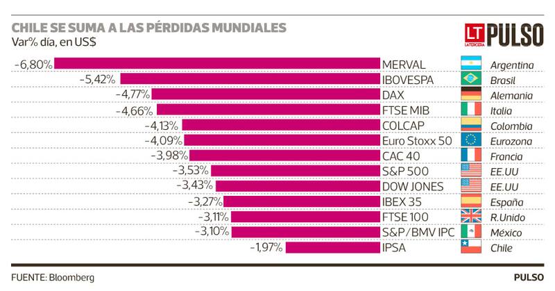Uno de los mayores retrocesos lo registró Buenos Aires, donde el Merval cerró con una variación de -6,80%. En Sao Paulo, el Bovespa cayó 5,4 puntos, mientras que en Alemania el Dax descendió 4,7% y el Dow Jones de EE.UU. lo hizo en 3,43%.