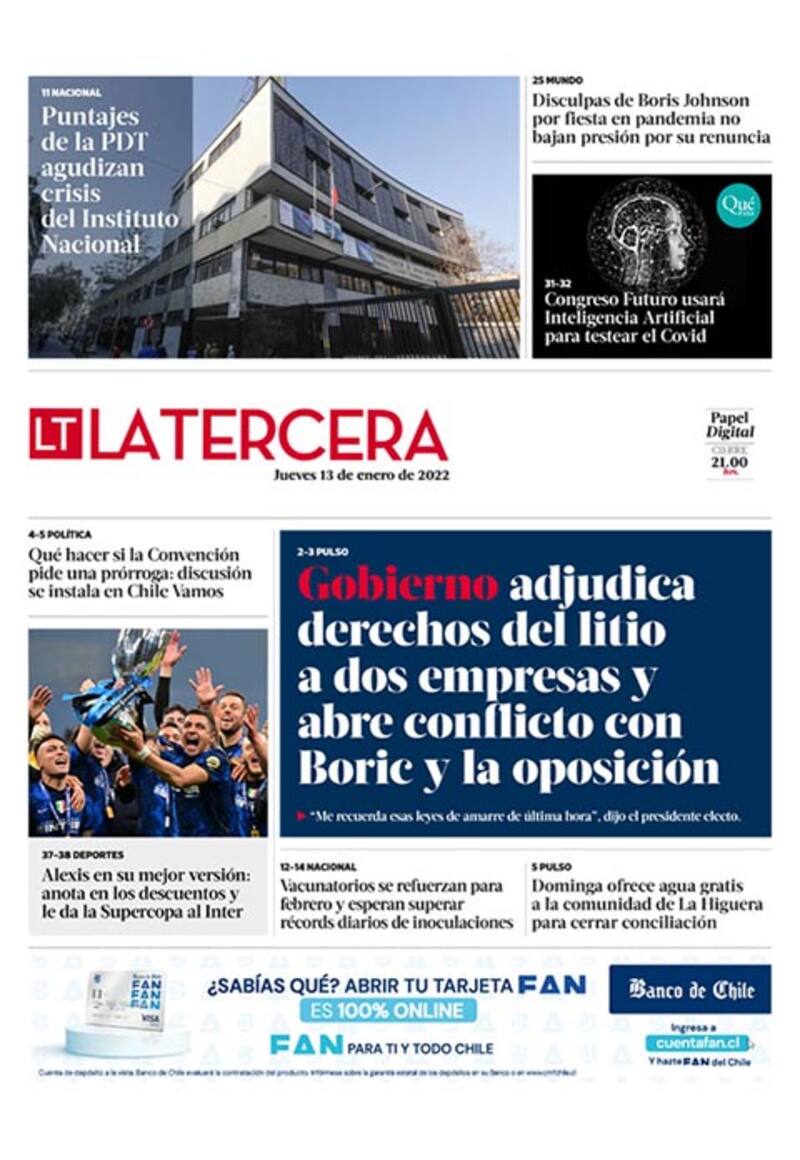 Por Mauricio DonosoLo que tienes que saber este jueves en La Tercera: gobierno abre conflicto con Boric tras adjudicar derechos del litio y se agudiza crisis del Instituto Nacional