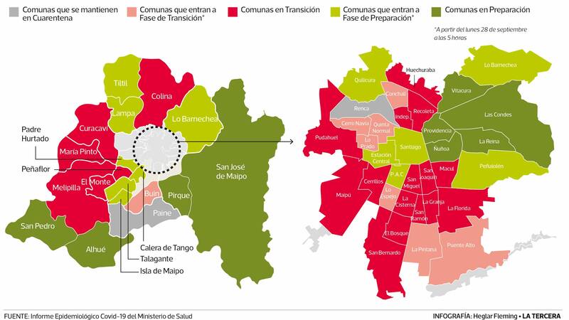 El desconfinamiento total de la Región Metropolitana estará a dos comunas de distancia: Renca y Paine. Todas las demás estarán libres de encierro luego de que este lunes salgan de cuarentena Puente Alto, La Pintana, Quinta Normal, Lo Prado, Cerro Navia, Conchalí, Lo Espejo y Buin.