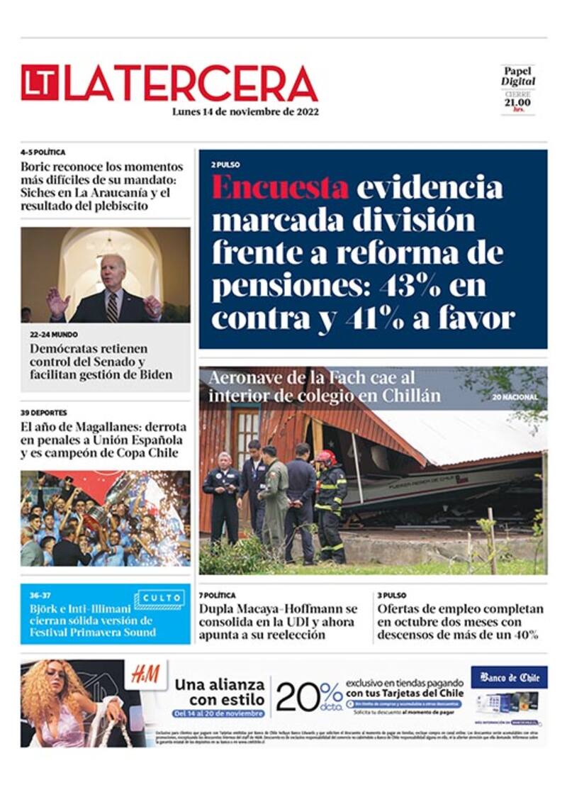 Por Mauricio DonosoLo que tienes que saber este lunes en La Tercera: sondeo de cadem muestra una división ante la reforma de pensiones: 41% está a favor y 43% en contra