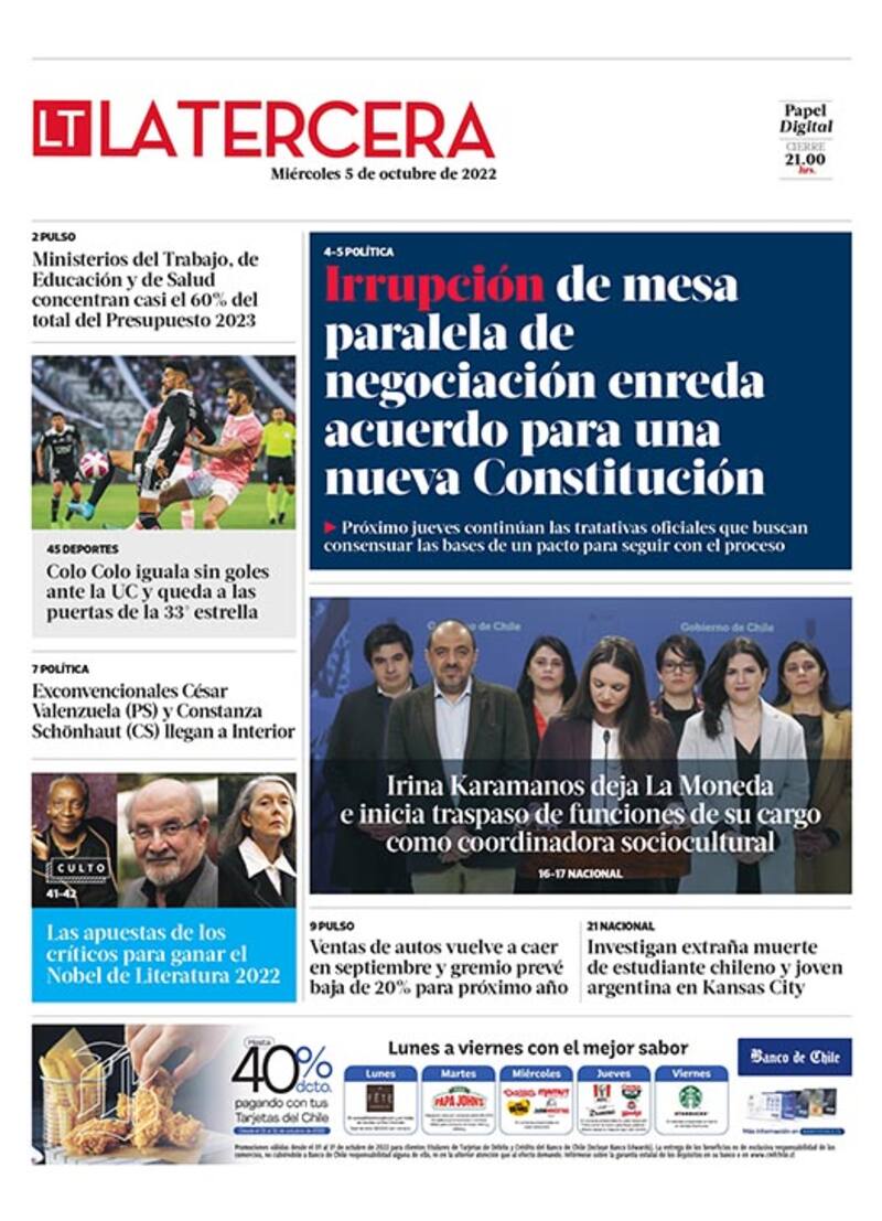 Lo que tienes que saber este miércoles en La Tercera: irrupción de mesa paralela enreda las negociaciones por un nuevo proceso constitucional