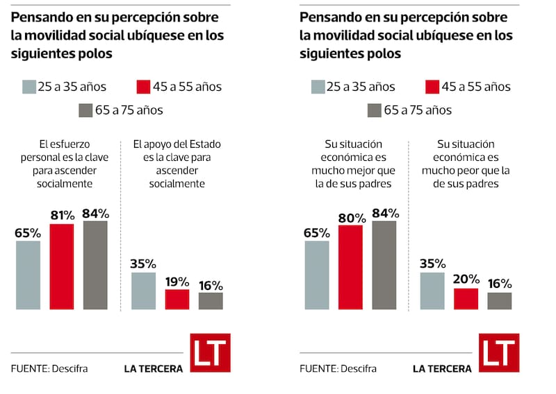 Cuando son consultados por el elemento “clave” para la movilidad social, si es que es el apoyo del Estado o el esfuerzo el que juega un papel principal, el esfuerzo cobra más fuerza en los de mayor edad que en los menores, pero en los tres segmentos predomina como elemento. En orden decreciente, en el rango de los 65-75 años un 84% asigna el “esfuerzo personal” como el elemento clave. La respuesta desciende a un 81% en el segmento de 45-55 años, y finalmente en los jóvenes de 25-35 años sigue siendo la respuesta mayoritaria, pero con un 65%.