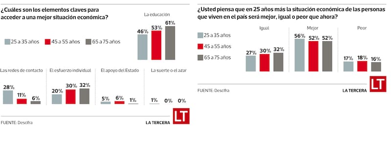 Los de mayor edad le dan mayor relevancia al impulso de los privados para fomentar el crecimiento económico, pero ven con mayor pesimismo que Chile se encuentre más cerca de alcanzar el desarrollo económico que hace 25 años.