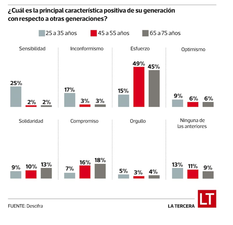Una de las principales diferencias intergeneracionales es el valor que le asignan los mayores al esfuerzo como característica propia de sus pares. A los encuestados se les consultó por la “principal característica positiva” en comparación a otras generaciones, y la variable “esfuerzo” fue la que lideró tanto en el grupo de 45 a 55 años, con un 49%, como en el grupo de 65 a 75 años, con un 45%. Los jóvenes de 25 a 35 años solamente en un 15% eligieron el “esfuerzo”, y respondieron en su mayoría la “sensibilidad”, con un 25% como la principal característica positiva. Esta última variable, en tanto, solo alcanzó un 2% en los otros grupos.
