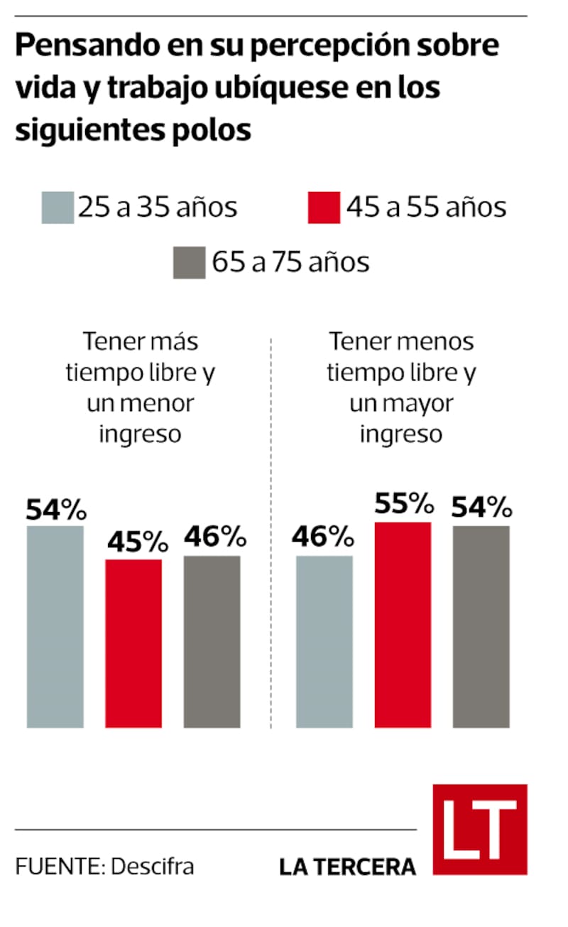 Esos son los datos que muestra la encuesta que demuestran que los jóvenes priorizan (54%) “tener más tiempo libre y un menor ingreso”, a diferencia de los de 45-55 años (45%) y los de 65-75 años (46%). Estos dos grupos mayores privilegian “tener menos tiempo libre y un mayor ingreso”. Ambos segmentos lo hacen con una cifra de respuesta del 55%.