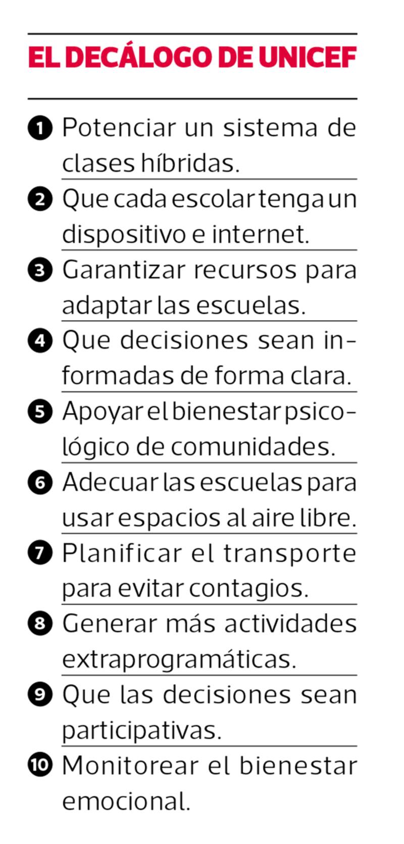 Para enfrentar este reto, la Unicef, junto a Educación 2020, América Solidaria y diversas organizaciones, estudiantes y actores de la educación, desarrollaron durante tres meses un decálogo de recomendaciones a las autoridades y sostenedores, que permitirían tener un mejor año escolar.