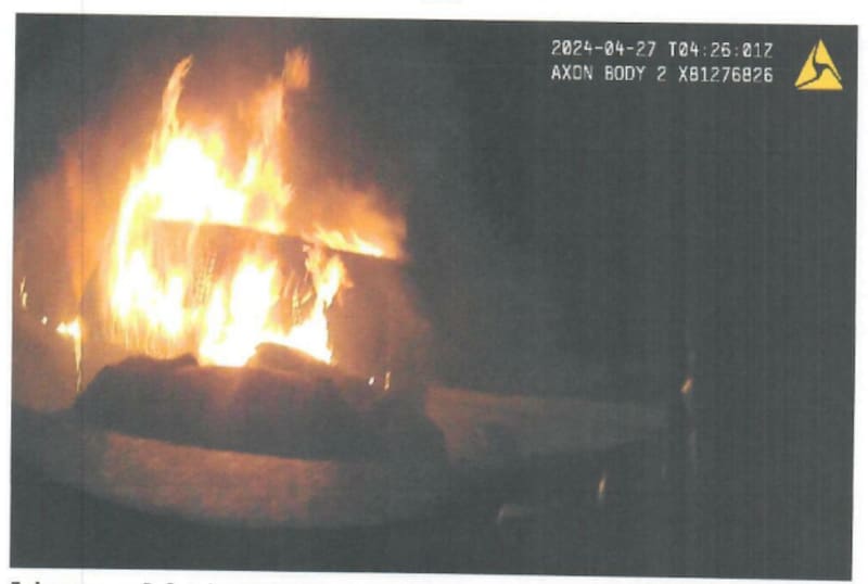 Siendo las 00.28.16, el jefe de patrulla le dijo al conductor “ahí nomás, quédate ahí, para para”, para luego comenzar a preguntarse por el armamento que debían haber portado quienes se trasladaban en la camioneta que seguía envuelta en llamas.