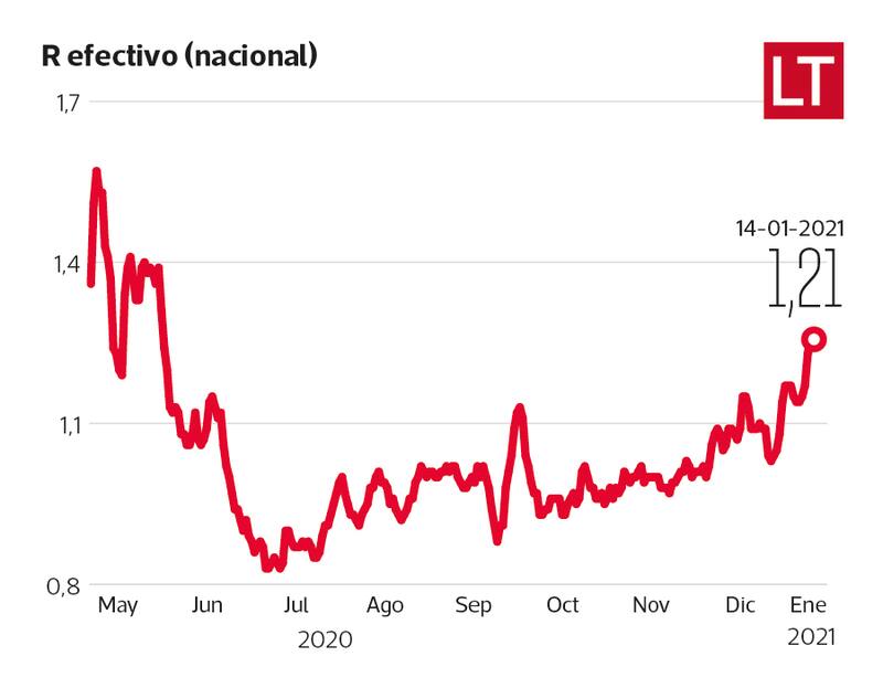 Un R efectivo (Re) de 1,21 -como el que se registró ayer a nivel nacional- puede traducirse en un aumento semanal de un 20% de los contagios a nivel nacional, pues cada infectado transmite la enfermedad a 1,21 persona. Según los cálculos del Centro de Modelamiento Matemático de la U. de Chile, todas las regiones del país están con un Re por sobre 1, es decir, en expansión, y por encima del umbral de seguridad -inferior a 1- que ha establecido la OMS para definir que la pandemia está bajo control.