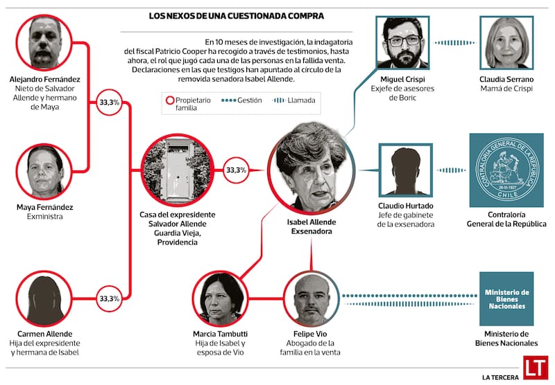 Según fuentes de La Tercera, la investigación de Cooper ha puesto en el centro del presunto delito de tráfico de influencias a la exsenadora Allende, dadas las supuestas presiones que habrían ejercido desde su entorno para acelerar el proceso. Sin ir más lejos, entre los antecedentes de la carpeta de investigación incluso figura un diagrama que estuvo bajo reserva y en el que se mapean dichas gestiones. En esa red se posiciona como pieza clave a la emblemática exsenadora del PS.