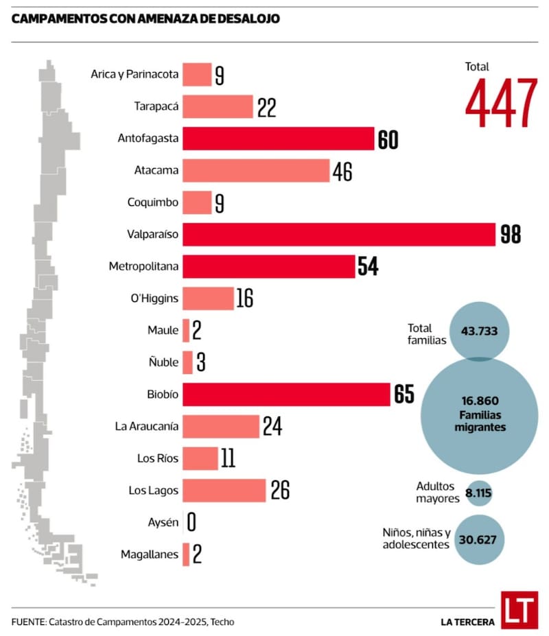 De un total de 1.428 campamentos existentes en Chile, 447 enfrentan una situación crítica: están bajo amenaza de desalojo. Esto significa que hay órdenes vigentes, juicios en curso o procesos administrativos que podrían derivar en el desalojo forzoso de las 43.733 familias que hoy habitan en asentamientos precarios a lo largo del país.