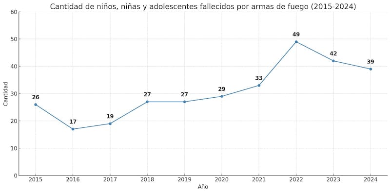 Hasta la segunda semana de septiembre 2024 ya se acumulaban 39 muertes de menores fallecidos a causa de armas de fuego, tres menos que en todo 2023, cuando fueron 42. A la estadística se deben sumar los recientes hechos ya descritos.