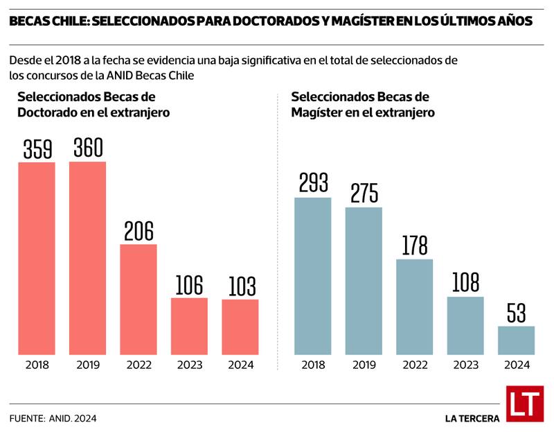 La secretaria de Estado puso sobre el tapete que hoy en Chile se puede estudiar un postgrado en casi cualquier materia sin necesidad de salir al exterior. Y que año a año la cifra de seleccionados va bajando: si en 2018 fueron 359 los elegidos para hacer sus doctorados en el extranjero, este año fueron 103. En magíster la cifra pasó de 293 a 53. Es decir, en 2024 entre seleccionados para estudiar con Becas Chile un doctorado o magíster sumaron 156.