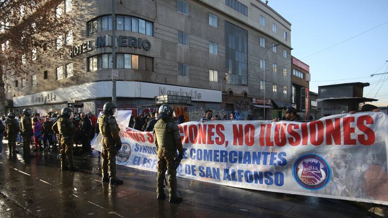 En Meiggs, un grupo de comerciantes cortó el tránsito en la Alameda con barricadas y fogatas. Carabineros acudió hasta el sitio para disuadir a los manifestantes, donde se registraron cuatro personas detenidas. Situación similar en la Plaza de Maipú, donde hubo 10 aprehendidos por desórdenes: 6 hombres y 4 mujeres.